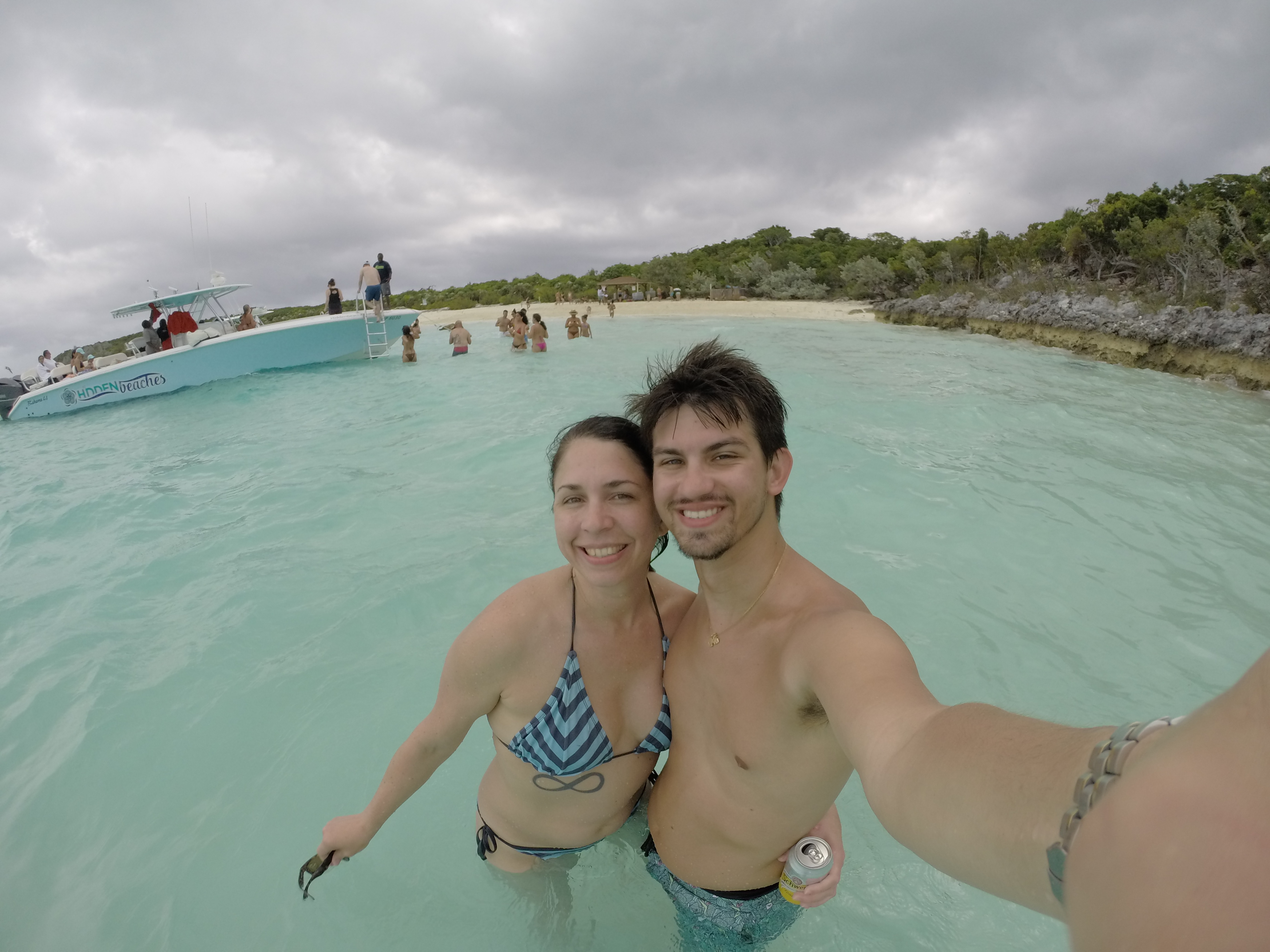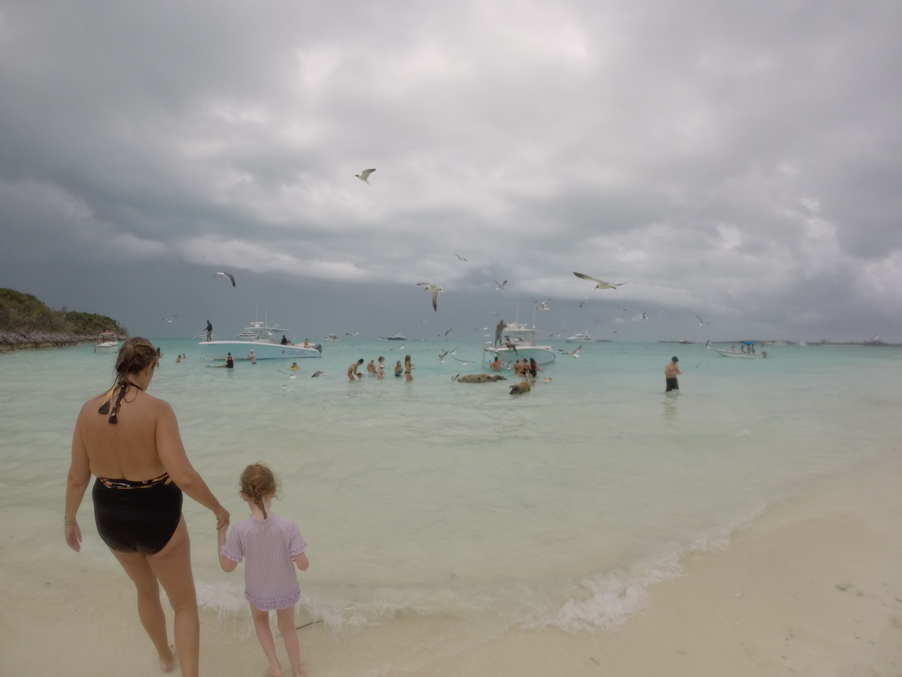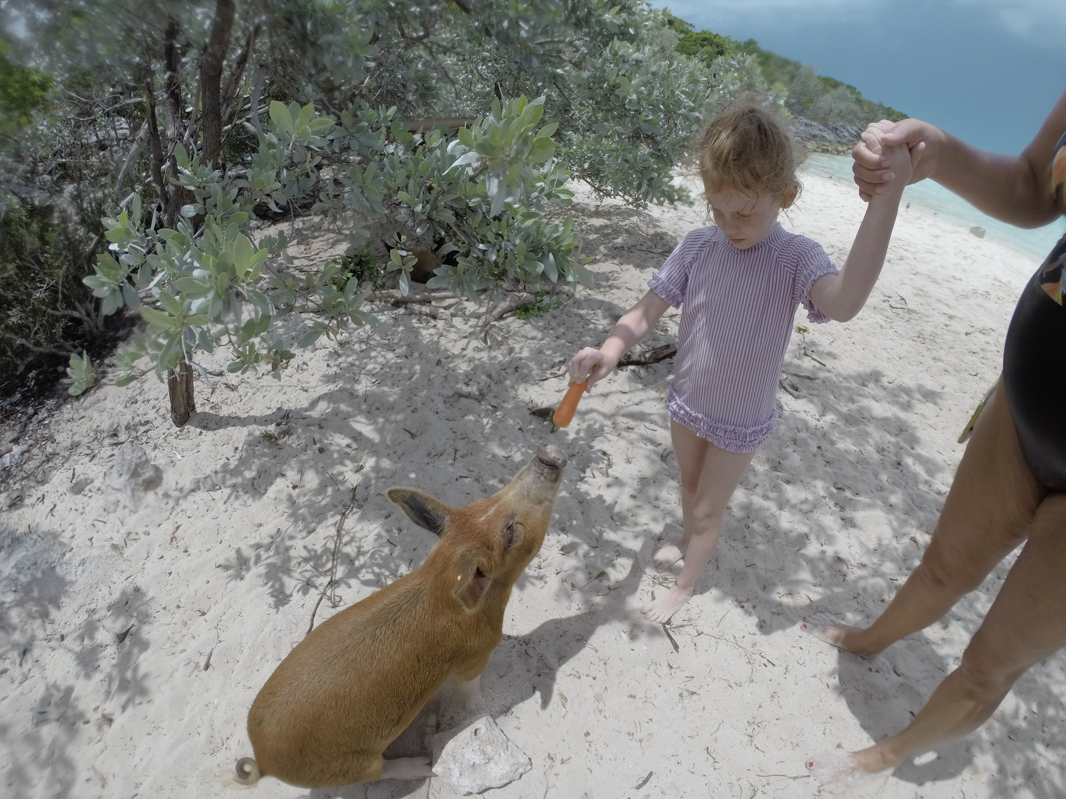 There was a variety of coral and reef fish, including sergeant majors, blue and purple damsels, parrotfish, yellow tangs, and many many more. (I unfortunately do not have many pictures, but I do have video clips and will include those of the beautiful fish when I complete the video.) I went in and out of the grotto multiple times through the few entrances, sometimes with my mom or sisters, then later with my niece and nephew. After towing around my niece around and within the grotto and convincing her that the fish were nice and did not want to touch her, she had a much more enjoyable time.As the tide was coming back in, it was then time to move on to our next stop, Pig Beach! I had visited Pig Beach a few years before on a diving trip but not with family, and it was a trip. My sisters and brothers-in-law were bewildered by such a sight and it was hilarious to see their reactions to the sheer size of these feral pigs. They immediately came up to the boat expecting to be fed and our Bahamian boat hands fed them and gave us carrots to give them. We perused the beach looking for nice pigs that weren’t too big so that the kids could feed them and not be stressed.
