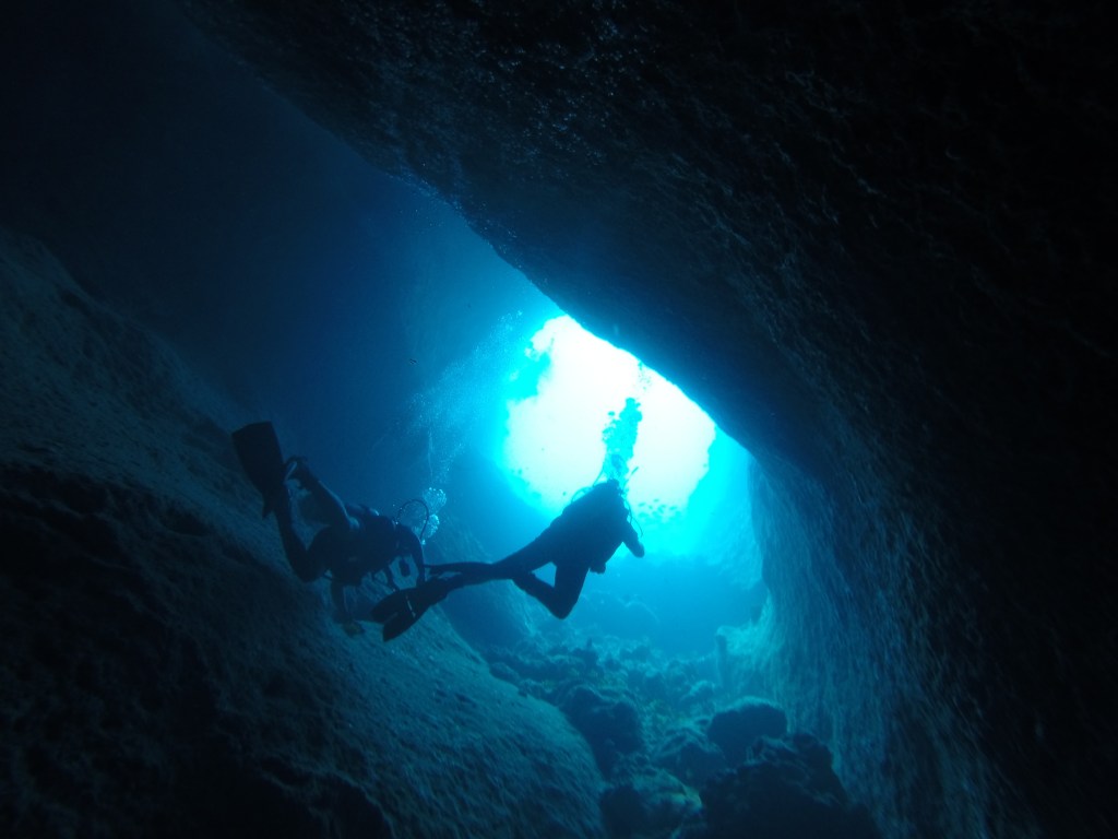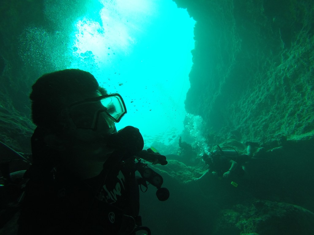 The second stop was located extremely close to where my family and I had visited the day before at Chat N Chill, almost in the marina actually. The site is called Angelfish Blue Hole. As we all jumped into the water, we were met with the site of shallow sands and coral around 30ft, but as we descended, we soon discovered the mouth of the hole that would take us far deeper. A fellow diver and I stuck together and began to enter the broad-mouthed cave, swimming against the current, first easily, then putting an effort forth and really getting a quad exercise as we kicked deeper and deeper. Eventually as the cave got tighter and the current got stronger (damn Bernoulli’s Equation) we had to reach for coral to hold onto while our legs rested a bit and we didn’t breath up all our air. We continued forward by crawling with our hands, my left hand getting minor cuts continuously by sharp rock and coral and my right being totally fine in the glove. I soon discovered the dive master a few feet ahead of us swinging through the current with his pole hook and no fins, an impressive feat to observe. As the cave tightened and the rest of the group caught up, the dive master told us we were at the point of no return around 90ft and that we had to turn back around, so we did. The rest of the dive was exiting back the same way we came and decompressing around 20ft.