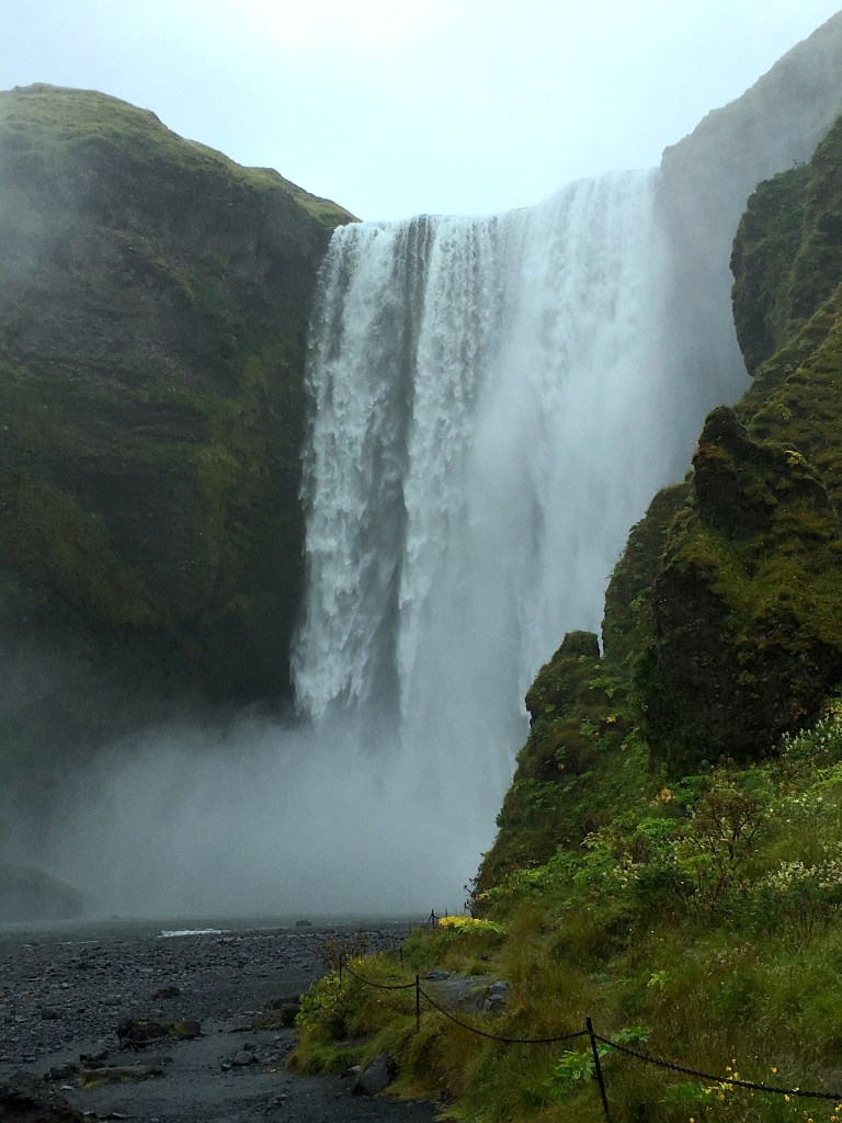 Skógafoss was HUGE. By the time we arrived it was very overcast and bleak outside but we continued to walk our way towards it from the parking area. As we stepped closer to the falls the air became misty and dampened our rain jackets. The mist clouded my camera lens so these images below have been saturated and sharpened to capture the majesty of this waterfall. There is a path that you can walk up that leads above the waterfall to a viewing area and onward for many kilometers, 26km to be exact, with all sorts of specs of beauty along the way. The verdant grass and moss surrounding the waterfall with the black stones beneath my feet meeting the water as it splashed down made me feel like I was in a fantasy land written ages ago. Perhaps in old Norse lore this very site was written about without us knowing.