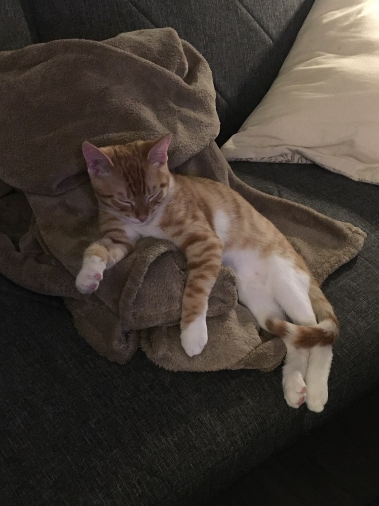 Other updates include a new fuzzy member to the family! In June we received a sweet orange tabby cat (that wears no pants because he has white hind legs) whom I’ve named Leif, after Leif Erikson. He’s still under a year old, and we got him when he was barely 8 weeks old. We love him dearly despite his boundless energy and his affinity to attack our older cat, Rotten.